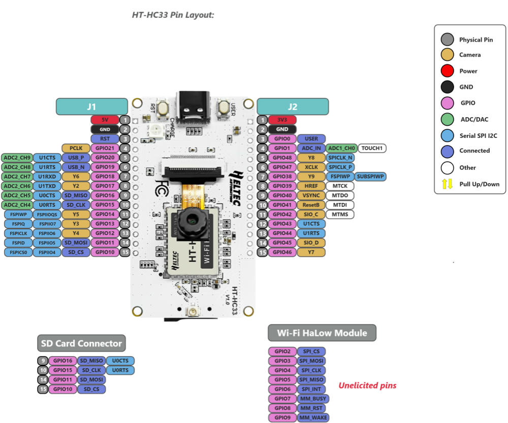 HT-HC33 is a built-in camera development board based on ESP32-S3 MCU and Wi-Fi HaLow module.
